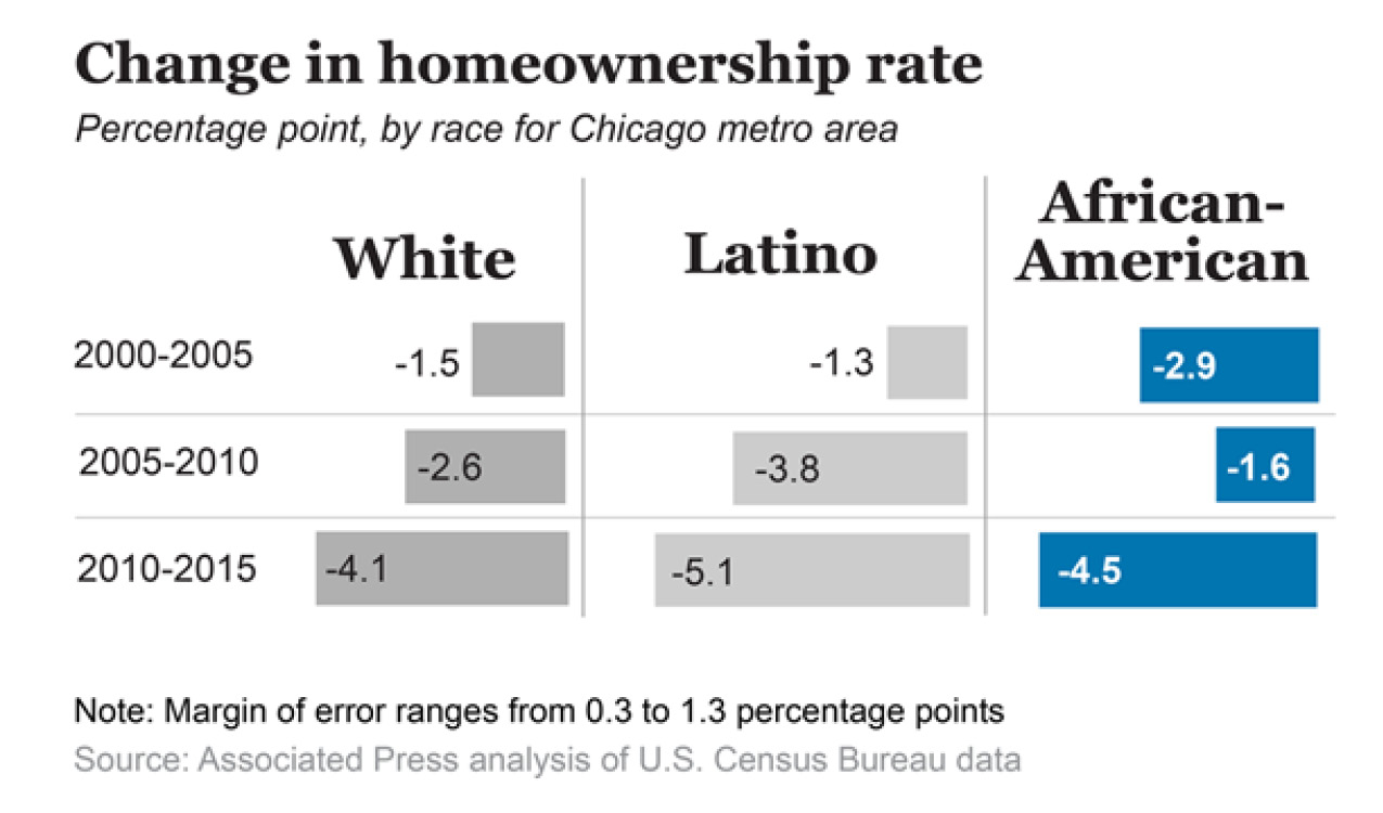 And in Chicago, the gap between black and white homeownership rates is even more extreme. Only 38.9 percent of African-Americans owned homes in the Chicago area in 2015, compared with 74 percent of whites. Before the housing crash, almost half of African-Americans in the Chicago area owned homes, according to Harvard's research. Latinos in the Chicago area also lag when it comes to homeownership. Only 50.5 percent of Latinos owned homes in the area in 2015.